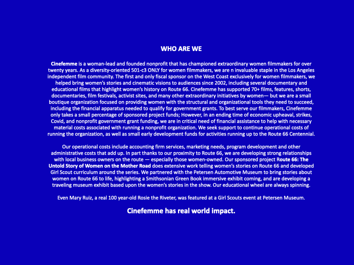 Cinefemme filmmakers persevere with our support despite numerous obstacles. We are a small boutique organization focused on providing women with specific opportunities, plus structural and organizational tools they needed to succeed, in particular the nonprofit backing and financial apparatus needed to qualify for government grants and tax-deductible fundraising. To best serve our filmmakers, Cinefemme only takes a small percentage of sponsored project funds; however these are unprecedented times. We are struggling with fires, strikes, natural disasters, economic upheaval and continued Covid recovery. Each tax-deductible donation makes a huge impact to help the women of our community. Moving into 2025, Cinefemme has more work to support than ever.