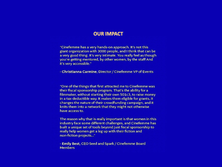 Cinefemme is the first fiscal sponsor in Hollywood exclusively for women filmmakers. We helped incubate and produce OVER SEVENTY feature films, shorts, festivals, and other projects by women, trans, queer, BIPOC, disabled, mothers and other marginalized talents. Established in 2002, Cinefemme is one of the oldest organizations working towards women’s equality in film. We empower women filmmakers.