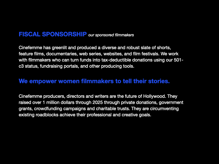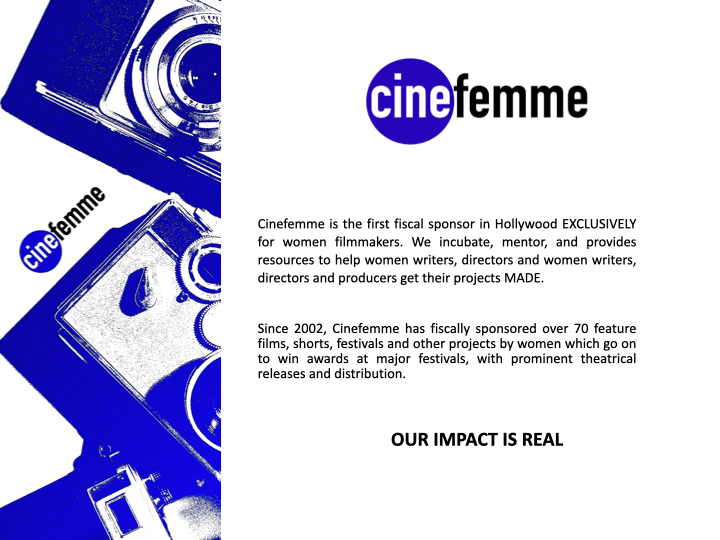 Cinefemme is the first fiscal sponsor in Hollywood exclusively for women filmmakers. We helped incubate and produce OVER SEVENTY feature films, shorts, festivals, and other projects by women, trans, queer, BIPOC, disabled, mothers and other marginalized talents. Established in 2002, Cinefemme is one of the oldest organizations working towards women’s equality in film. We empower women filmmakers.