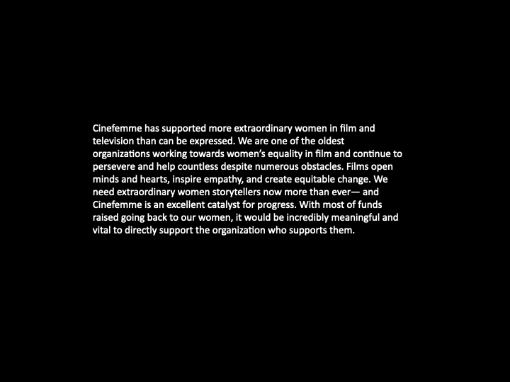 Cinefemme filmmakers persevere with our support despite numerous obstacles. We are a small boutique organization focused on providing women with specific opportunities, plus structural and organizational tools they needed to succeed, in particular the nonprofit backing and financial apparatus needed to qualify for government grants and tax-deductible fundraising. To best serve our filmmakers, Cinefemme only takes a small percentage of sponsored project funds; however these are unprecedented times. We are struggling with fires, strikes, natural disasters, economic upheaval and continued Covid recovery. Each tax-deductible donation makes a huge impact to help the women of our community. Moving into 2025, Cinefemme has more work to support than ever.