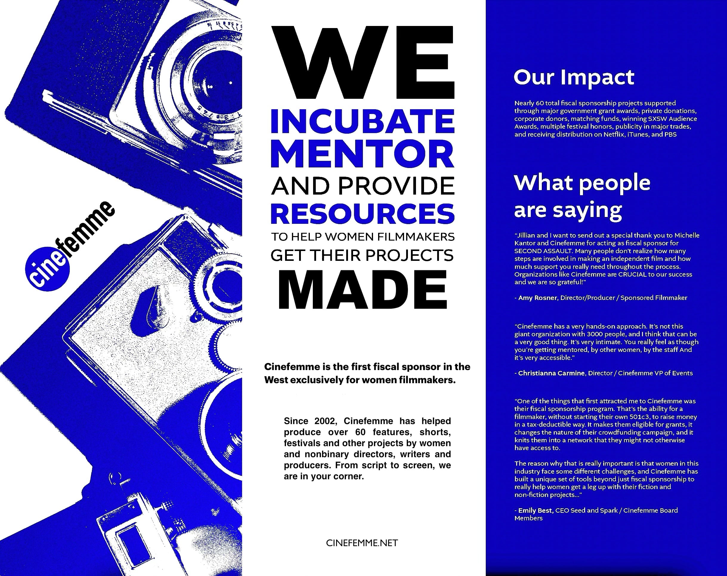 Cinefemme is the FIRST fiscal sponsor exclusively for women filmmakers in the West. We helped produce over seventy feature films, shorts, festivals and other projects by women.